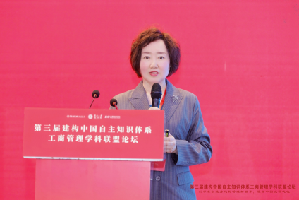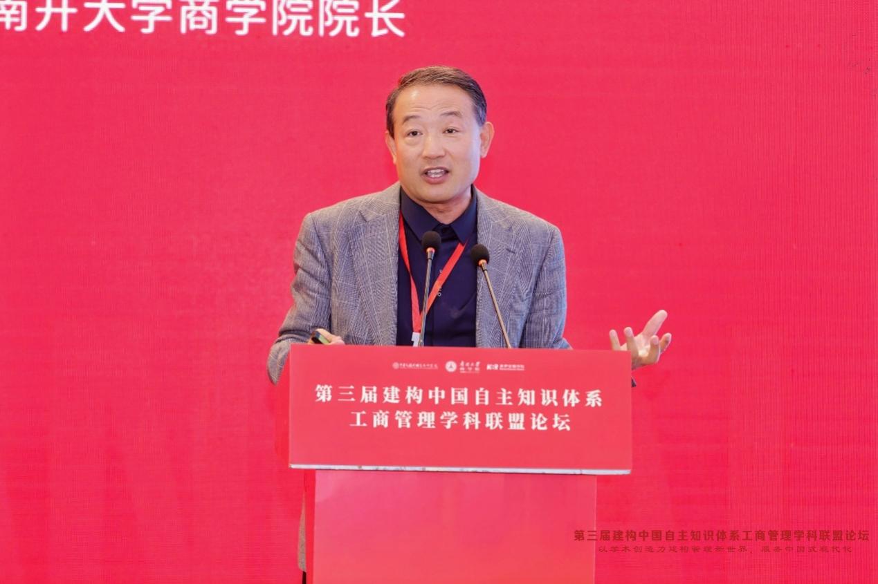 陈雨露在致辞中代表南开大学向与会专家学者的到来表示感谢。他指出,南开大学工商管理学科历经百年积淀,在前几轮学科评估取得重要突破。本次论坛旨在为繁荣中国哲学社会科学、特别是工商管理学科建设凝聚共识、形成合力。构建中国自主的知识体系,既是党中央的重大战略部署,也是实现中国式现代化发展的内在要求。高校作为哲学社会科学研究的主力军,要以中国历史与社会为背景,凝练知识、创新理论,突破学科边界,紧扣新发展理念、高质量发展、人类命运共同体等标志性概念,不断推动理论升华与全球传播。工商管理学科应立足中国特色社会主义市场经济体制特点,发挥文明大国规模优势,坚持党的领导和以人民为中心的发展思想,在制度体系完善与现代化产业体系建设中,切实发挥知识创新和方法创新的引领作用。