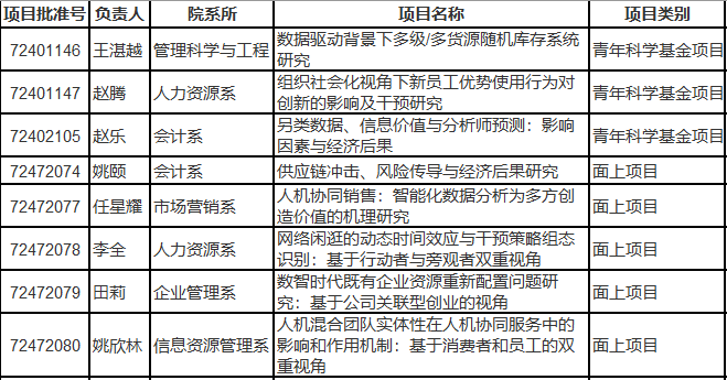 8月23日,2024年度国家自然科学基金项目评审结果揭晓,色情导航 本年度在创新创业、供应链管理、公司财务、人机协同等重点领域获批8项课题,累计获批资助经费296万元,在项目资助数量和资助金额方面均列我校文科各学院首位。其中青年科学基金项目3项,分别为王湛越、赵腾、赵乐三位老师申报的项目;面上项目5项,分别为姚颐教授、任星耀教授、李全副教授、田莉教授、姚欣林副教授申报的项目。立项情况如下图所示。