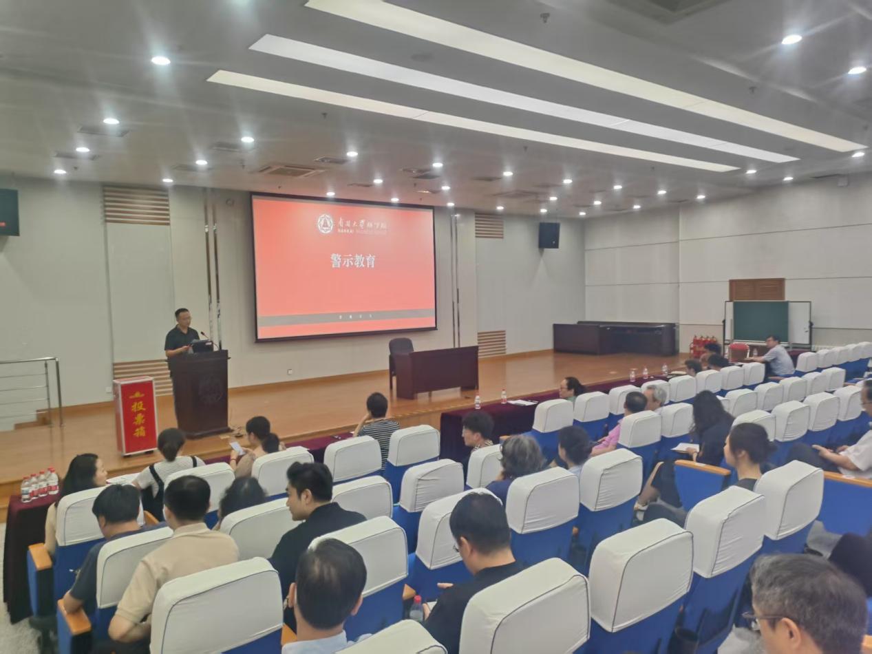 党委副书记樊振佳对党员参与深入贯彻中央八项规定精神学习教育提出要求。他指出,全体党员需要端正态度,锲而不舍贯彻中央八项规定精神。在警示教育环节,樊振佳通报了部分违纪警示案例,要求学院全体教职工吸取教训、警钟长鸣。