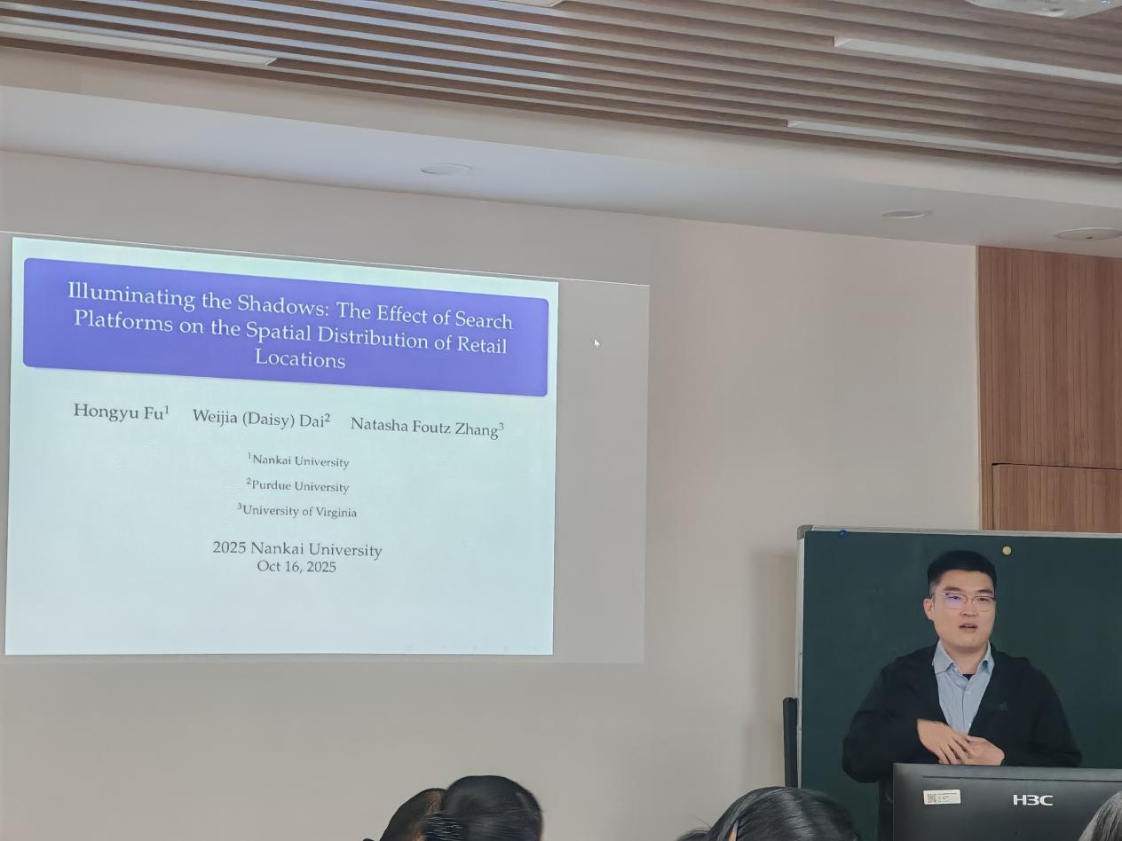 本次论坛邀请到市场营销系傅宏宇老师分享相关研究成果,聚焦“用户平台对零售企业的空间分布影响”,探究消费者信息检索能力提升后餐馆选址角色的变化。具体探讨两大问题:一是平台是否使餐馆倾向非显眼位置,二是这种影响对总体居民幸福效应的作用。