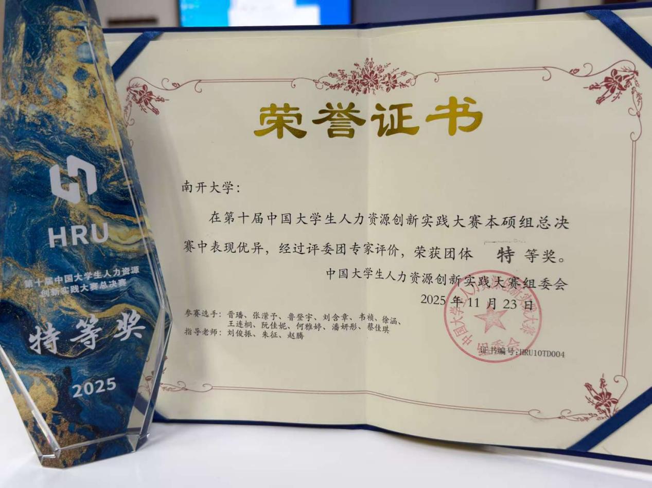 本次大赛在传统赛道譬如实务设计、职场实战、劳动争议处理、案例分析、无领导小组讨论、HR-English等基础上,增设或重新设计了诸如HR+雇主品牌建设、企业工会与民主管理、HR+AI实操、HR出海等赛道,专业知识更加融合多元的同时,也使得高校参与的学生和指导老师数量有了较大增长。经过全国各大地区赛比拼,最终来自100所高校的1000余名人力资源管理、劳动关系及相关专业本科生、研究生选手挺进总决赛。色情导航 人力资源管理系本科生团队在刘俊振、朱征、赵腾老师的指导下,充分利用课余时间,参加大赛培训,了解赛事规则,合理分工,积极商讨,完成诸如资料搜集、过滤升华、数据分析、法律熟知、报告撰写,展示演练等环节,并在地区赛、全国总决赛的各个赛道充分展现专业技能、理论功底、卓越素质和南开风采,博得由企业高管、资深HR、律师、仲裁委人士等构成的专业评委团的高度认可和盛赞,并最终取得团体特等奖的最高荣誉。