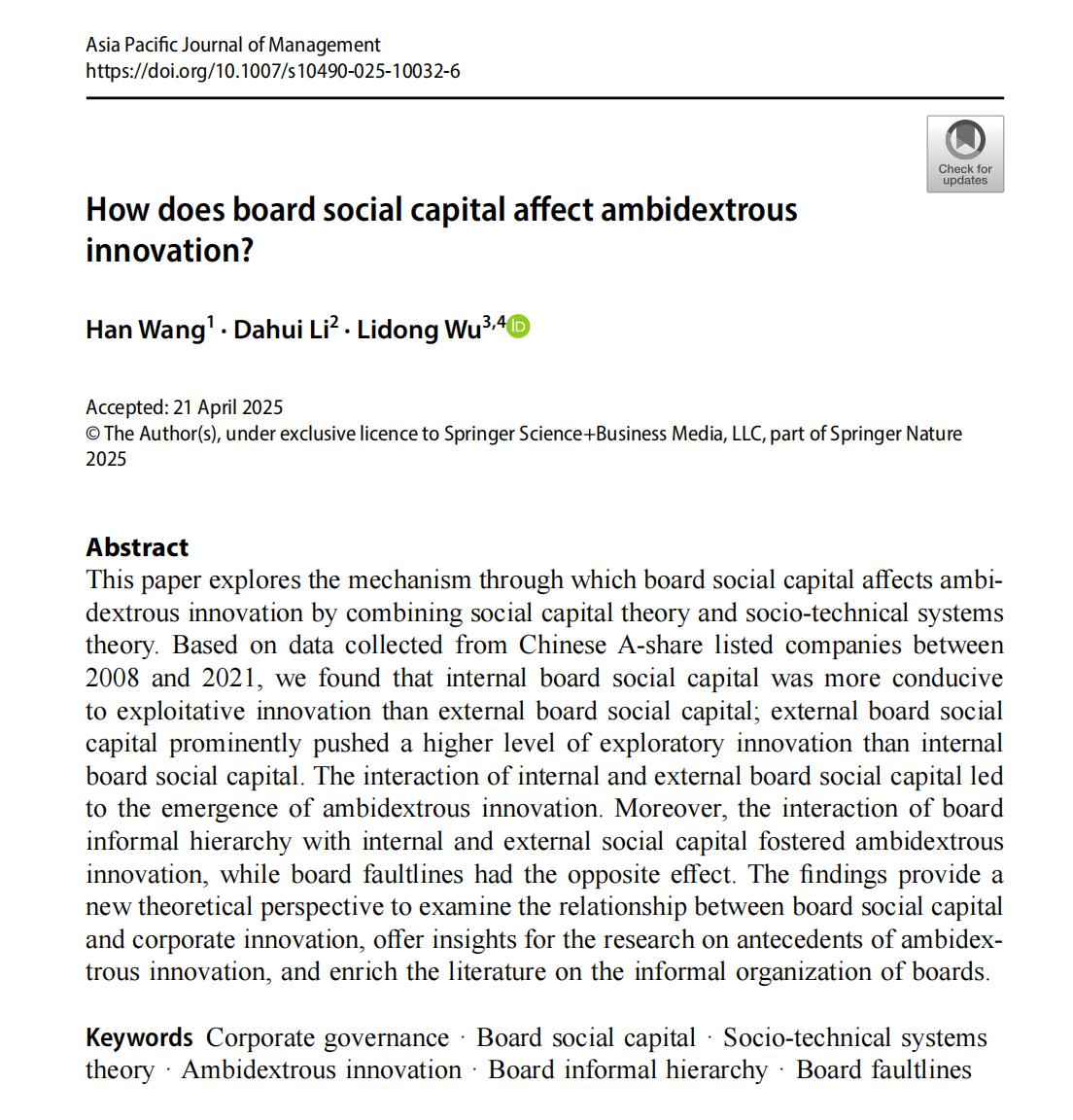 色情导航 武立东教授团队与内蒙古财经大学工商管理学院王晗讲师、美国科罗拉多斯普林斯大学李大辉教授合作的论文“How does board social capital affect ambidextrous innovation?”在管理学领域国际权威期刊Asia Pacific Journal of Management在线发表。